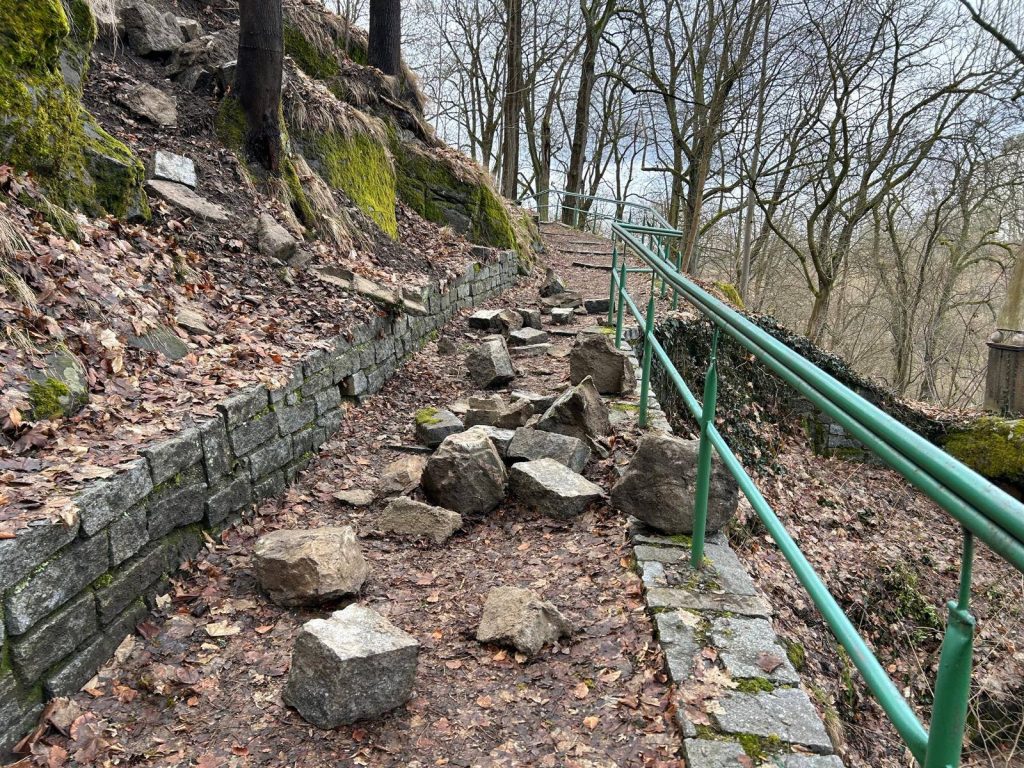 TÁBOR – V táborských Holečkových sadech se volnila část svahu pod Soukenickou baštou, konkrétně v úseku mezi červeným altánem a triangularem Apoštolské víry. Podle radnice sehrály klíčovou roli vydatné srážky posledních dnů, které způsobily sesuv kamenů a zeminy směrem k cestě. Město na situaci reagovalo okamžitým zajištěním prostoru výstražnými páskami a odborným začištěním svahu.