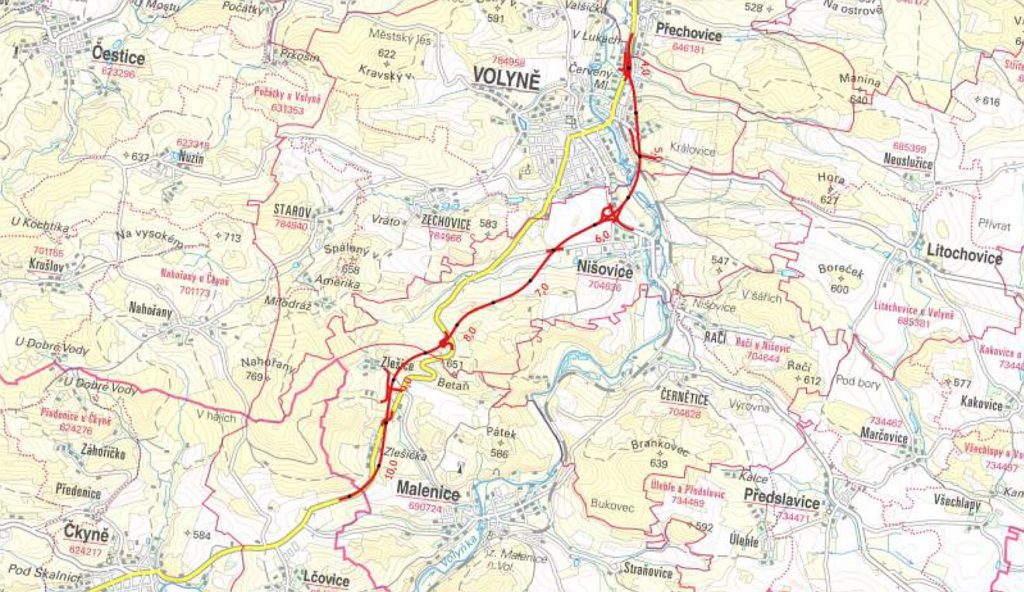 Aktuálním záměrem je výstavba přeložky silnice I/4 v úseku Volyně – Zlešice, o které se mluví už řadu let. Zatím je ale pořád jen na papíře. „Přeložka začíná severně od Volyně a končí přibližně na hranicích katastrů Malenic a Lčovic. Délka přeložky je zhruba sedm kilometrů. Stavba na začátku a na konci úpravy navazuje na stávající silnici I/4. Přeložka silnice je navržená jako dvoupruhová směrově nerozdělená silnice první třídy,“ uvádí v dokumentu krajský úřad.