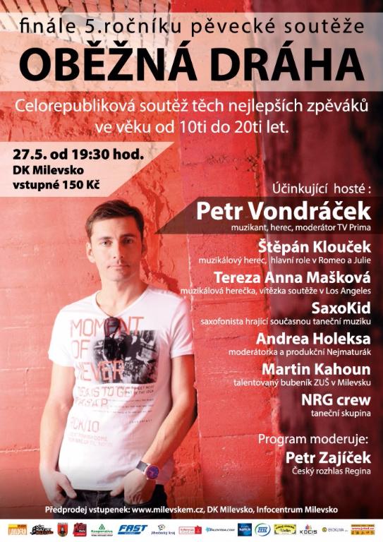 Soutěžící tradičně vystupují ve dvou písničkách, v programu se představí také bubeník Martin Kahoun ze Základní umělecké školy v Milevsku. Taneční vystoupení a choreografie budou opět z dílny úspěšné milevské taneční skupiny NRG crew. V úvodu Oběžné dráhy vystoupí i dvě sportovní gymnastky Klára Honzíková z Milevska a Diana Kotalíková z Přeštěnice. Na Oběžnou dráhu přijede talentovaný saxofonista, který pod uměleckým jménem SaxoKid často vystupuje v zahraničí. V závěru finále zahraje organizátor soutěže Jaromír Kašpar svou vlastní tvorbou a uvede své hosty. Celý večer bude moderovat Petr Zajíček z Českého rozhlasu Regina. Program začne v půl osmé večer.