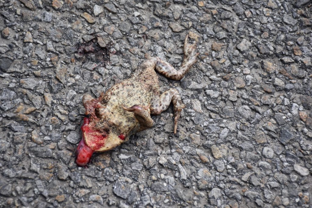 První označený migrační úsek se směrem od Frymburku nachází u Světlíku, druhý je každoročně na kopci ve Větřní. Na oba úseky upozorňují dopravní značky, na obou místech jsou na asfaltu vidět desítky rozježděných žab. Ve Větřní si to jedna žabka namířila přes silnici dnes kolem druhé odpoledne. Rychlé zastavení na kraji silnice na blikačkách se záměrem přenést žabku na druhou stranu přišlo pozdě. Další přijíždějící auto ji přímo v přímém přenosu přejelo. Ani značky nepřiměly řidiče dívat se pozorněji před sebe na vozovku…