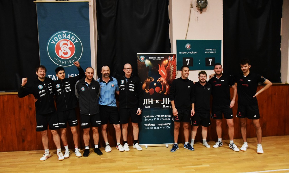 VODŇANY – Jedna výhra, jedna remíza. S takovou bilancí vyšli stolní tenisté vodňanského Sokola z dalšího dvojkola první ligy, ve kterém měli výhodu domácího prostředí. V sobotu porazili osmý TTC MS Brno, který nepřijel v kompletní sestavě, jednoznačně 8:3, a druhý den uhráli nerozhodný výsledek 7:7 s třetím Agrotec Hustopeče. Vodňanští jsou v tabulce na pátém místě, na svém kontě mají 19 bodů za čtyři výhry, dvě remízy a tři porážky.