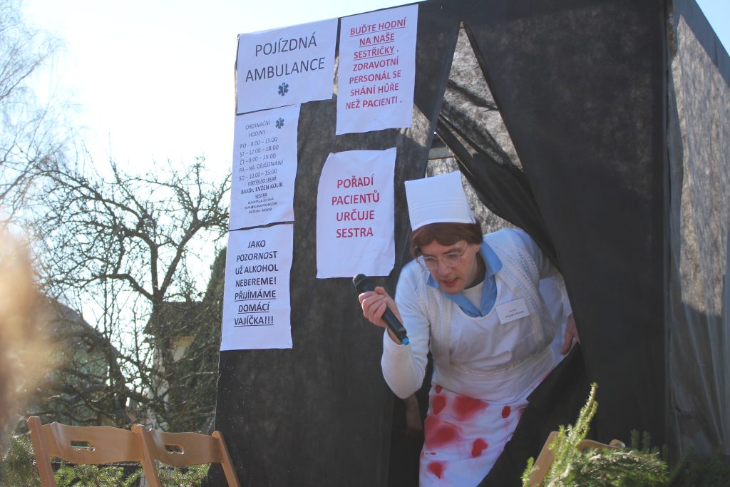 Sraz byl dopoledne u restaurace U Anděla. Mezi diváky se mísili skladníci s rudlíkem, pletací babičky s klubky v ruce, porybní s rybáři i Ferda mravenec – práce všeho druhu. Vyjela i pojízdná ambulance. Zdravotní sestru Bohumilu Šilhavou ztvárnil David Blažek, Drahoslavu Píchalovou místostarostka Jana Vorlová a Růženu Mokrou Jana Kalinová. Do role lékaře Evžena Kolíka se vžil starosta Jiří Rangl. Společně nabízeli vyšetření rovnou na ulici a bavili kolemjdoucí.
