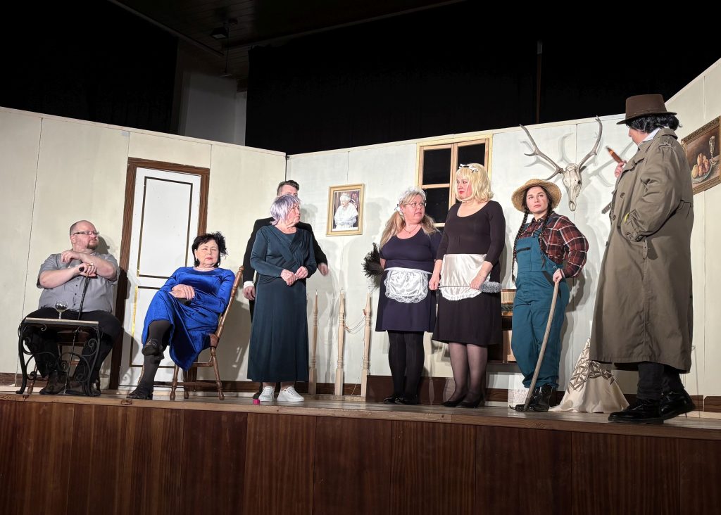 Mezi podezřelé patřila lady Ham-milk-tonová, kterou hrála Jitka Pincová starší, lordovy milenky i služebnictvo. Služku Lauru hrála Jitka Pincová mladší, služku Amandu Kateřina Štroufová a zahradnici Míšu Paurová. Do děje vstupovala také redaktorka Pamela Pulicerová v podání Boženy Dvořákové. Vyšetřování se snažil usměrnit konstábl Crashman, kterého si zahrál Lukáš Vach. Součástí inscenace byl také hlas z rádia, který patřil Pavlu Dvořákovi mladšímu. O výtvarnou podobu představení se postaral Pavel Dvořák starší, který připravil kulisy a scénu, technické zajištění měl na starosti Vít Kolář.