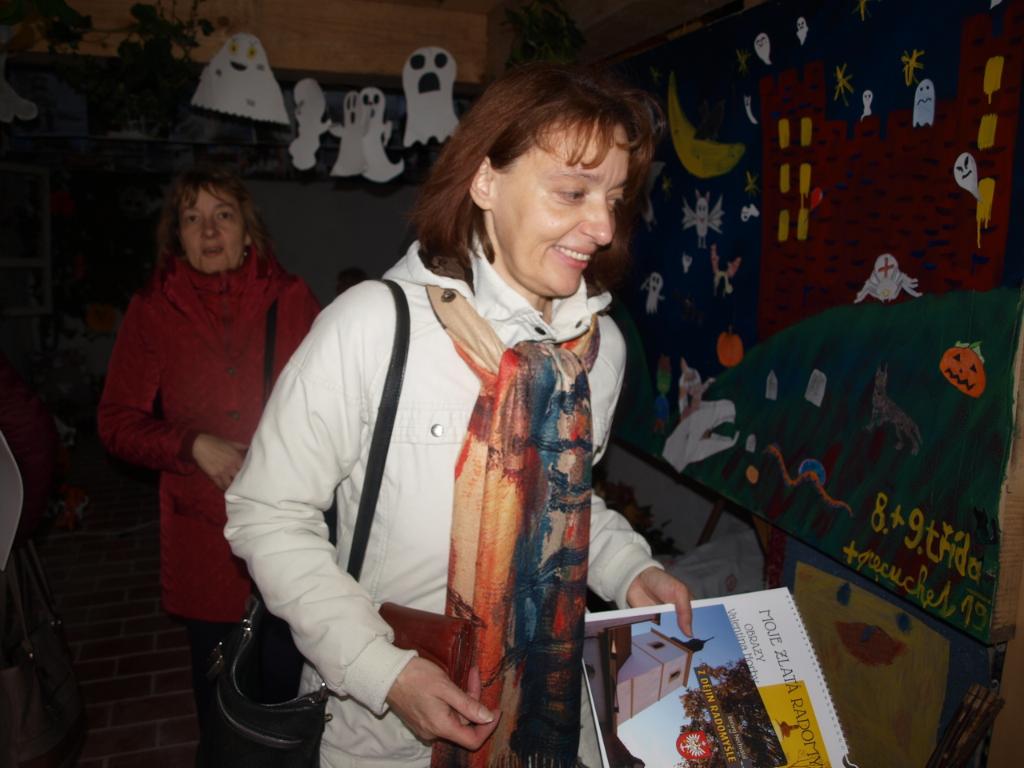 Návštěvníci oslavy nejprve prošli přízemní částí komendy a prohlédli si výstavu dětí z místní mateřské a základní školy, plnou obrázků, světýlek, dýní, duchů a strašidel.
