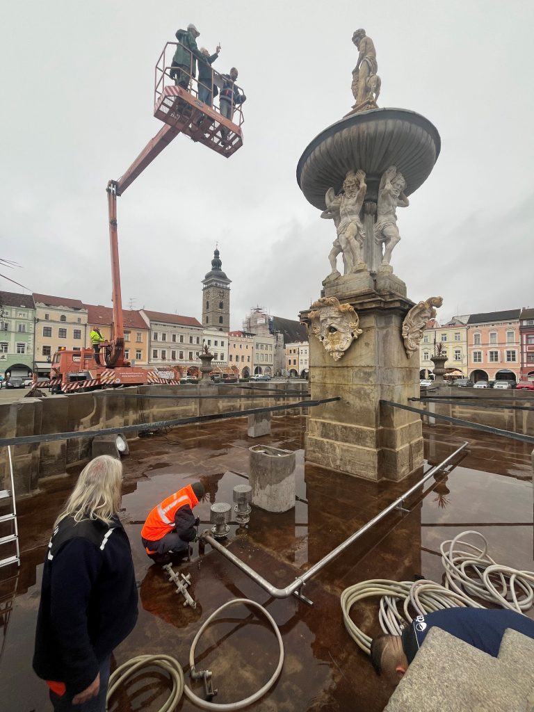 ČESKÉ BUDĚJOVICE – Samsonova kašna na náměstí Přemysla Otakara II. v Českých Budějovicích se připravuje na zimní sezonu. Pracovníci společnosti ČEVAK vypustili a vyčistili její hlavní bazén a odstranili z něj napadané předměty, kterých bylo letos mnohem méně než v předchozích letech.