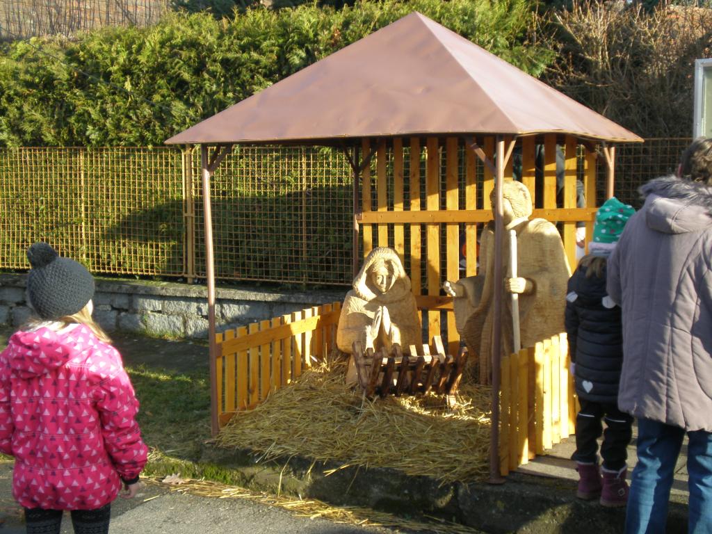 Ježíšek vyřezaný ze dřeva tak doplnil další dvě dřevěné postavy, Marii a Josefa, v malém betlému, který je od začátku prosince umístěn před budovou úřadu. Autorem soch je Lukáš Mach, absolvent učiliště v Oselcích. Jak se zrodil nápad na toto setkání? „Inspiroval jsem se v nedalekých Kasejovicích. Oproti tamní tradici máme ale jednu změnu, kdy tam mají Ježíška v jesličkách od začátku, my jsme si ale řekli, že ho umístíme až na Štědrý den. Aby bylo opravdu vidět, že v adventu je to čekání na Ježíše, poté na Štědrý den, respektive Boží hod vánoční, což je hlavní svátek, přichází slavnost jeho narození a to už by v jesličkách být měl,“ upřesnil místostarosta obce Vladimír Červenka.