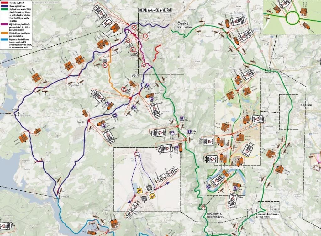 Vozidla do 20 tun budou jezdit z Krumlova po silnici II/157 do Kaplice nádraží, po silnici I/3 až k Dolnímu Dvořišti, silnice II/163 až na křižovatku silnic II/163 a II/160. Dále pojedou přes Rožmberk nad Vltavou pouze pro vozidla do 20 tun až do Větřní a zpět po stejné trase.