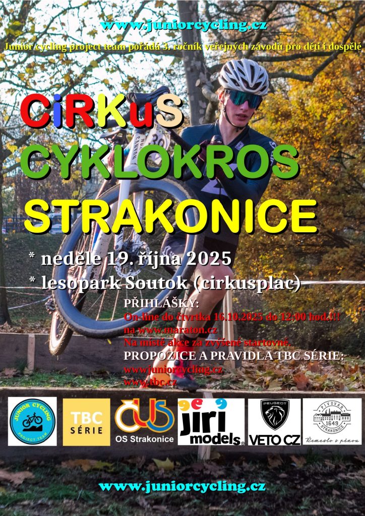 Junior cycling projekt team pořádá třetí ročník cyklokrosového závodu ve Strakonicích. Koná se v neděli 10. října v lesoparku Soutok. Starty kategorií: v 10 hodin první kategorie dětí, ve 13.30 muži open, muži E, ženy, juniorky, kadetky, kadeti; ve 14.30 hodin muži a junioři. Závodí se podle pravidel TBC série 2025. Parkoviště je zřízeno na cirkusplacu Pod Hvězdou.