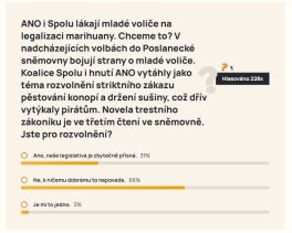 Legalizace marihuany podle hlasování v anketě z minulého týdne zajímá čtenáře JčTEĎ podstatně méně, než třeba navyšování podpory Ukrajině či otázka, která profesní skupina by si zasloužila navýšit platy. Podle čtenářů portálu JčTEĎ to v rozporu s míněním ministryně obrany Jany Černochové nejsou vojáci – pro ně hlasovalo jen 7…