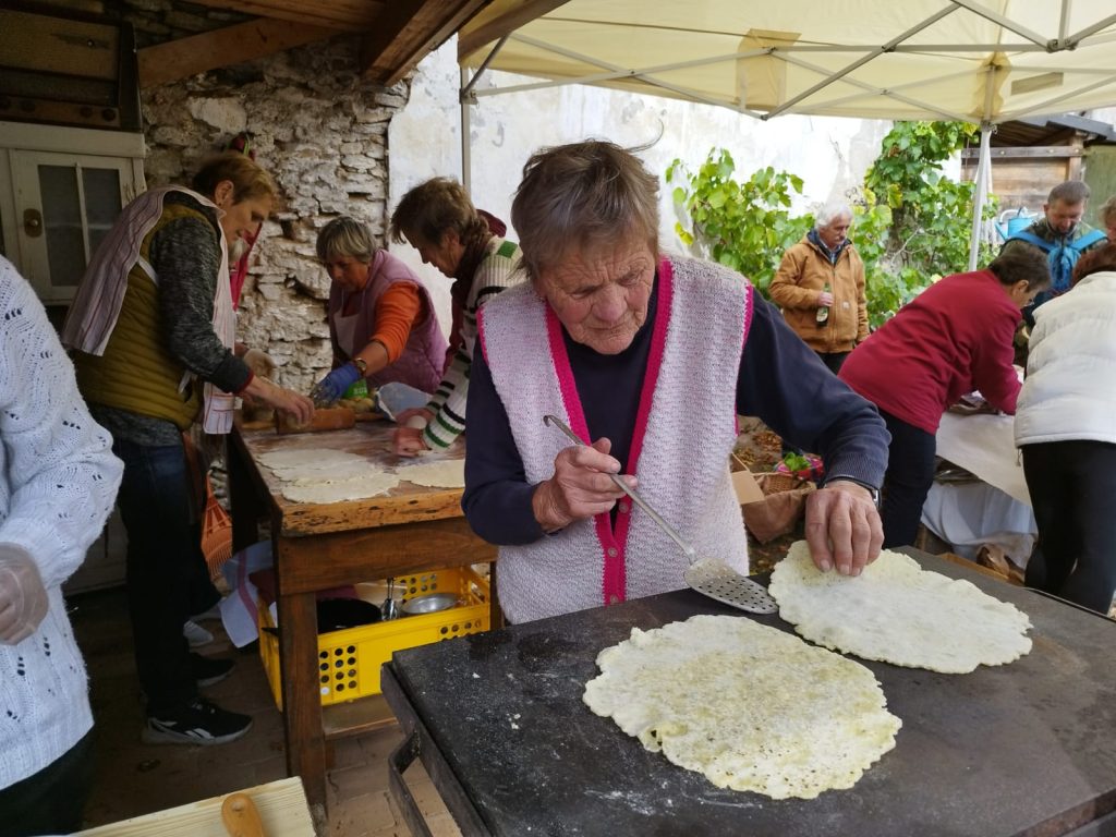 Jejich recept nám prozradily členky spolku, které se zhostily výrobního procesu i prodeje, Irena Žáčková, Jana Bartošová a Růžena Hrdá. „Uvaříte brambory ve slupce, necháte vychladnout, oloupete a nastrouháte na struhadle. Přidáte rovnoměrný poměr hladké a hrubé mouky, sůl a majoránku. Následně vytvoříte těsto, které tvarujete do koulí. Necháte několik desítek minut odležet a pak koule rozválíte. Pečou se takzvaně na tálu, nebo přímo na plotně bez oleje. Když jsou upečené namažou se v sádle s česnekem a přidají se povidla,“ prozrazují členky Spolku přátel Velešína. Na letošní pečení spotřebovaly pilné ženy přes 25 kilogramů brambor.