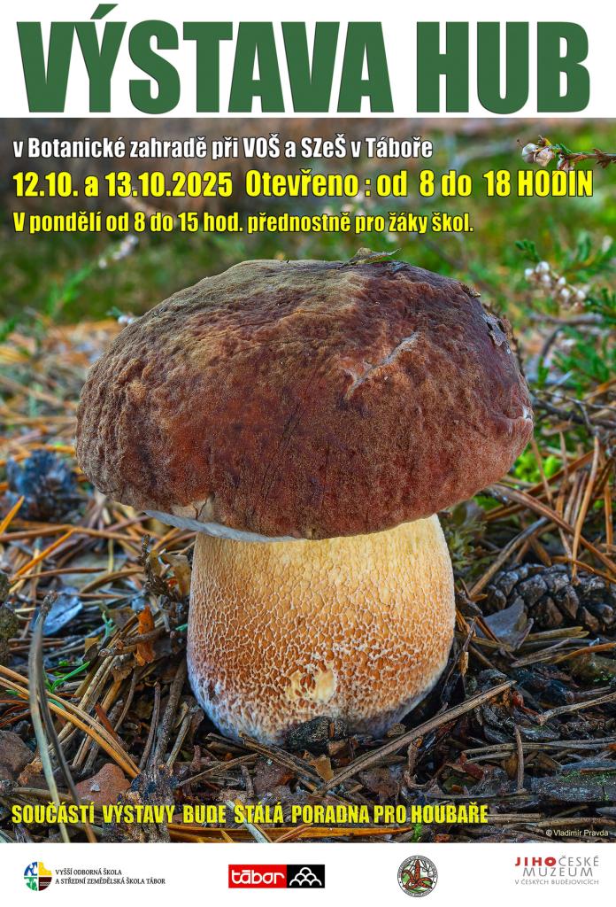 TÁBOR – Botanická zahrada při Vyšší odborné škole a Střední zemědělské škole Tábor zve na výstavu hub, která proběhne od neděle 12. do pondělí 13. října. Návštěvníci uvidí čerstvě nasbírané houby z Táborska, Novohradských hor i Českobudějovicka. Otevřeno bude od 8 do 17 hodin. Po celou dobu akce bude fungovat mykologická poradna, pondělí dopoledne pak bude patřit hlavně školám.