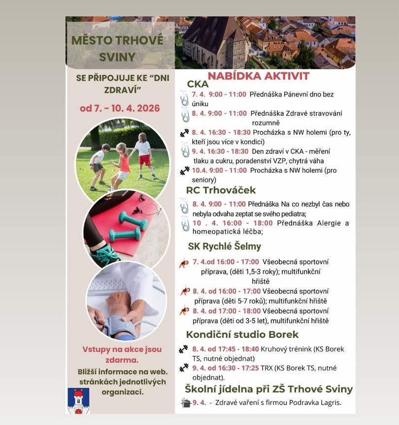 TRHOVÉ SVINY – Od 7. do 10. dubna se Trhové Sviny zapojí do celostátní akce Dny zdraví. Město spolu s místními organizacemi připravilo sérii přednášek, sportovních aktivit i zdravotních konzultací. Vstup na akce je zdarma.