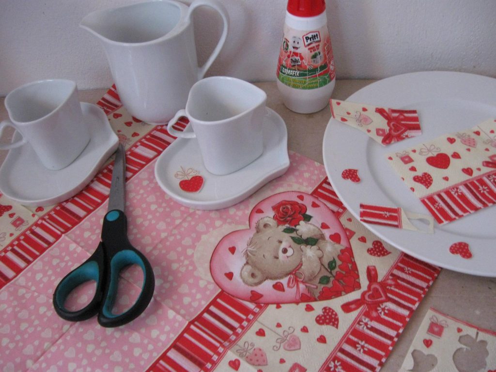 Z valentýnského ubrousku vystřihneme vhodné motivy a rozmístíme je na bílý porcelán.