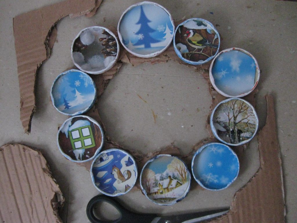 Zavírací víčka ze zavařovaček natřeme na okrajích bílou akrylovou barvou a necháme zaschnout. Mezitím si připravíme vhodné obrázky, pohlednice nebo ubrousky se zimními motivy, na které obkreslíme víčka potřebných velikostí a vystřihneme. Kolečka s obrázky vlepíme dovnitř víček.