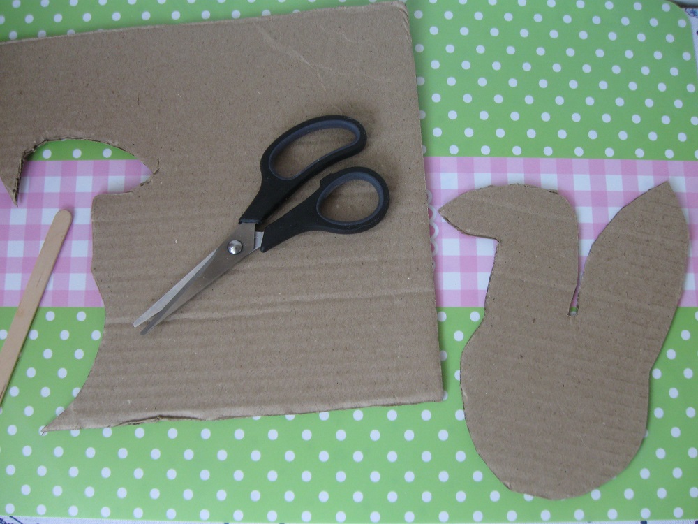 Začneme tím, že si na pevný karton nakreslíme obrys zajíčkovy hlavy a vystřihneme ji. Zezadu přilepíme špachtli na zapíchnutí (dobře nám poslouží třeba dřívko od nanuka). Potom potřeme celou přední stranu lepidlem a plochu hustě posypeme hoblinami. Můžeme je lehce rukou přitlačit.
