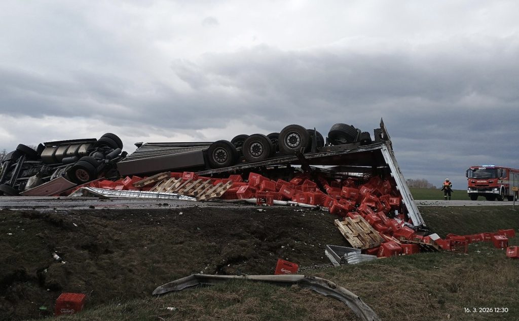 U obce Sedlec se převrátil kamion s pivem. Silnice I/20 bude několik hodin uzavřena