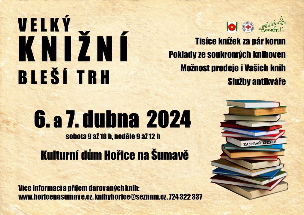 Velký knižní bleší trh se uskuteční v kulturním domě v Hořicích na Šumavě. V sobotu 6. dubna ho můžete navštívit od 9 do 18 hodin. O den později od 9 do 12 hodin.