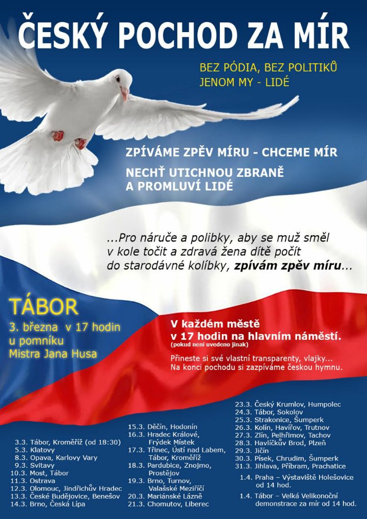 V Táboře se pochod uskutečnil 10. března, 12. března bude v Jindřichově Hradci, 13. března v Českých Budějovicích, 23. března se průvod připravuje v Českém Krumlově, 24. března znovu v Táboře, 25. března ve Strakonicích, 30. března v Písku a 31. března v Prachaticích. Prvního dubna je pak na 14. hodinu naplánována demonstrace za mír v Táboře a ve stejnou dobu v Praze na holešovickém výstavišti.