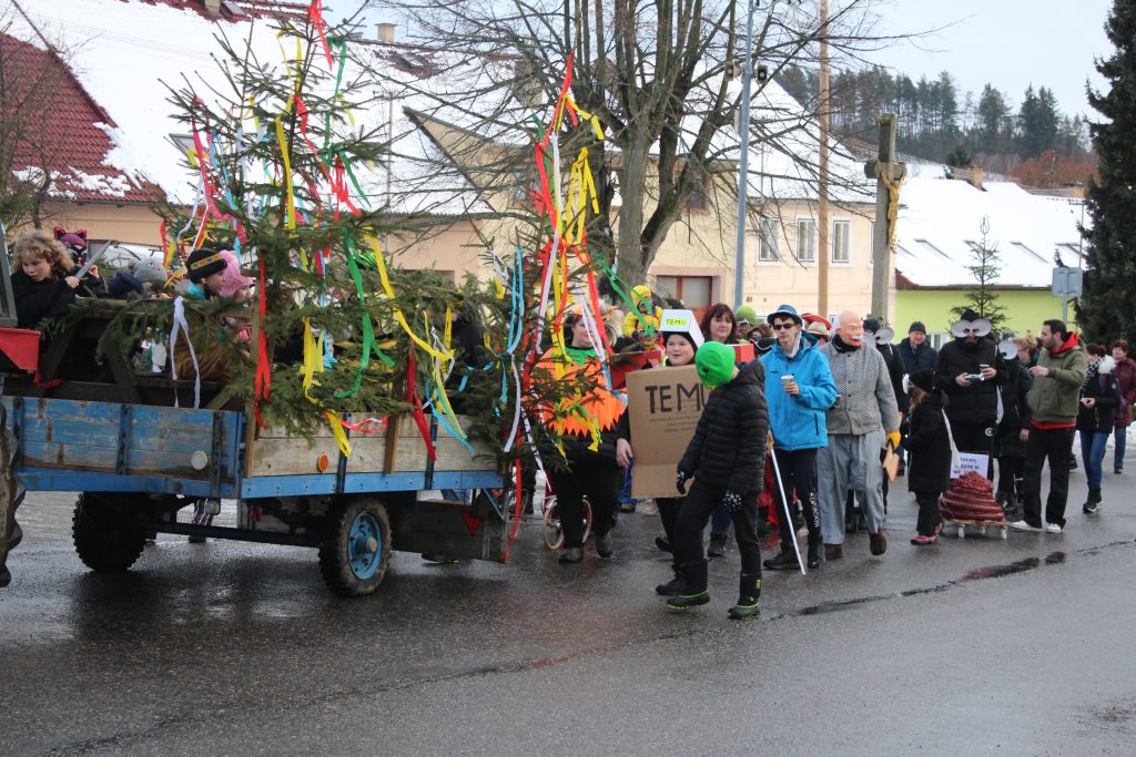 Od čtyř odpoledne před budovou postávaly skupinky masek a dolaďovaly kostýmy. Z oken se podávalo svařené víno, koblihy a boží milosti, které připravily pracovnice obecního úřadu. Hudební doprovod zajistil harmonikář Martin Stehlík.