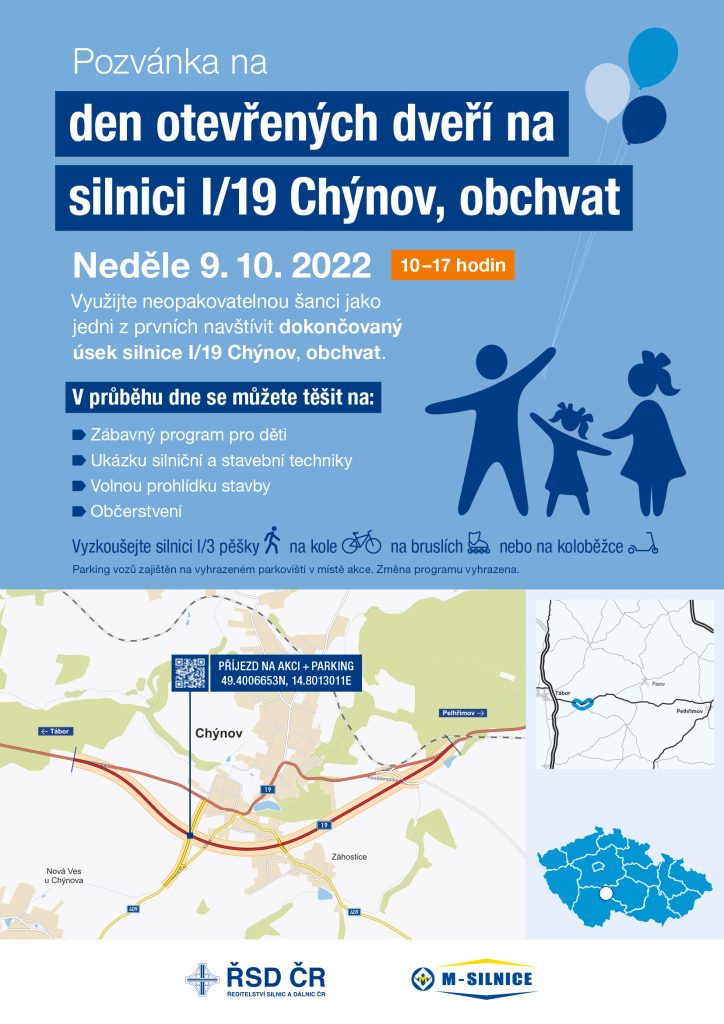 TÁBOR - Den otevřených dveří na právě dokončovaném obchvatu Chýnova na silnici I/19 připravilo na neděli 9. října od 10 do 17 hodin Ředitelství silnic a dálnic. Účastníci akce tak budou mít možnost jako jedni z prvních dokončovaný úsek stavby navštívit.