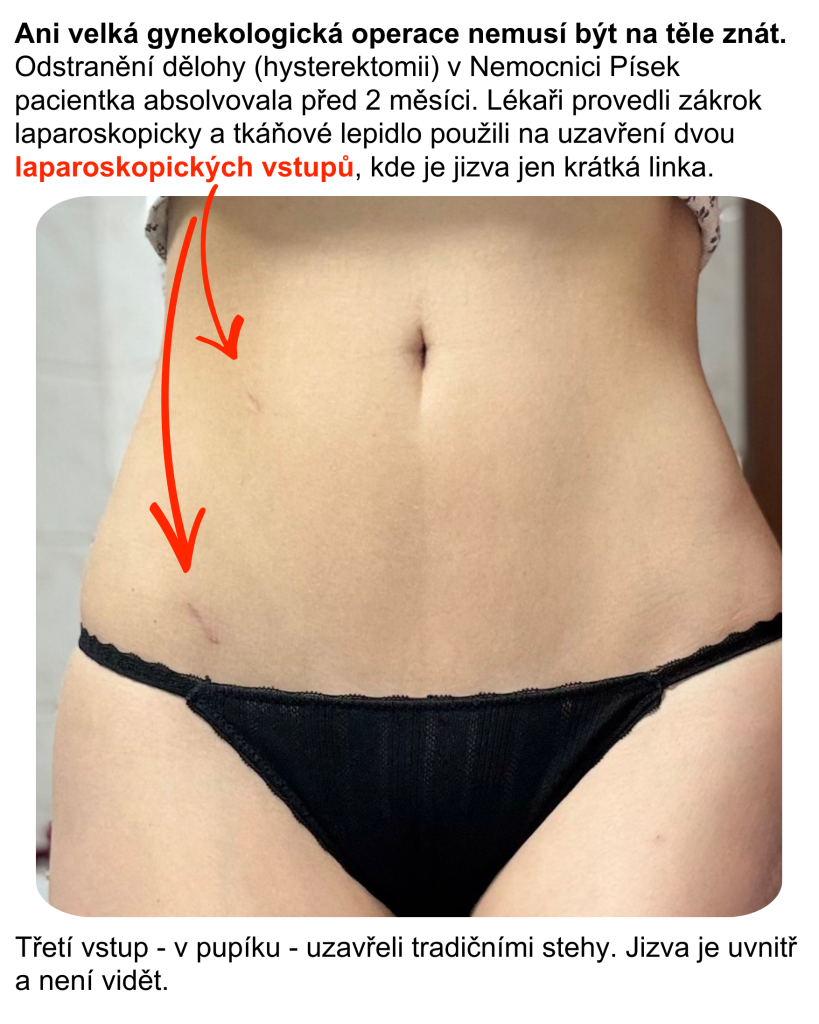 Lepidlo zajistí stejnou pevnost jako stehy, zároveň podporuje přirozené hojení a chrání před infekcí. „Navíc slibuje výrazně lepší kosmetický efekt než tradiční stehy, tedy minimální jizvy na břiše. V případě klasického šití vzniká po laparoskopických vstupech jizva ve tvaru křížku, zatímco při použití tkáňového lepidla je jizva jen v podobě krátké linky. Tento způsob adaptace kůže ještě zlepšuje výsledný efekt již tak miniinvazívních laparoskopií, což pacientky velmi vítají,“ doplnil Michal Turek.
