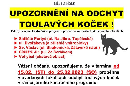 Kočky vždy odchytávají strážníci městské policie, kteří mají osvědčení o odborné způsobilosti pro odchyt zvířat bez pána, toulavých a opuštěných zvířat a zacházení s nimi. V žádném případě by je lidé neměli chytat sami, protože by tím porušili platnou legislativu. Více informací k odchytu a kastraci toulavých koček poskytne městská policie na telefonu 382 213 225 nebo odbor životního prostředí, telefon 382 330 661.