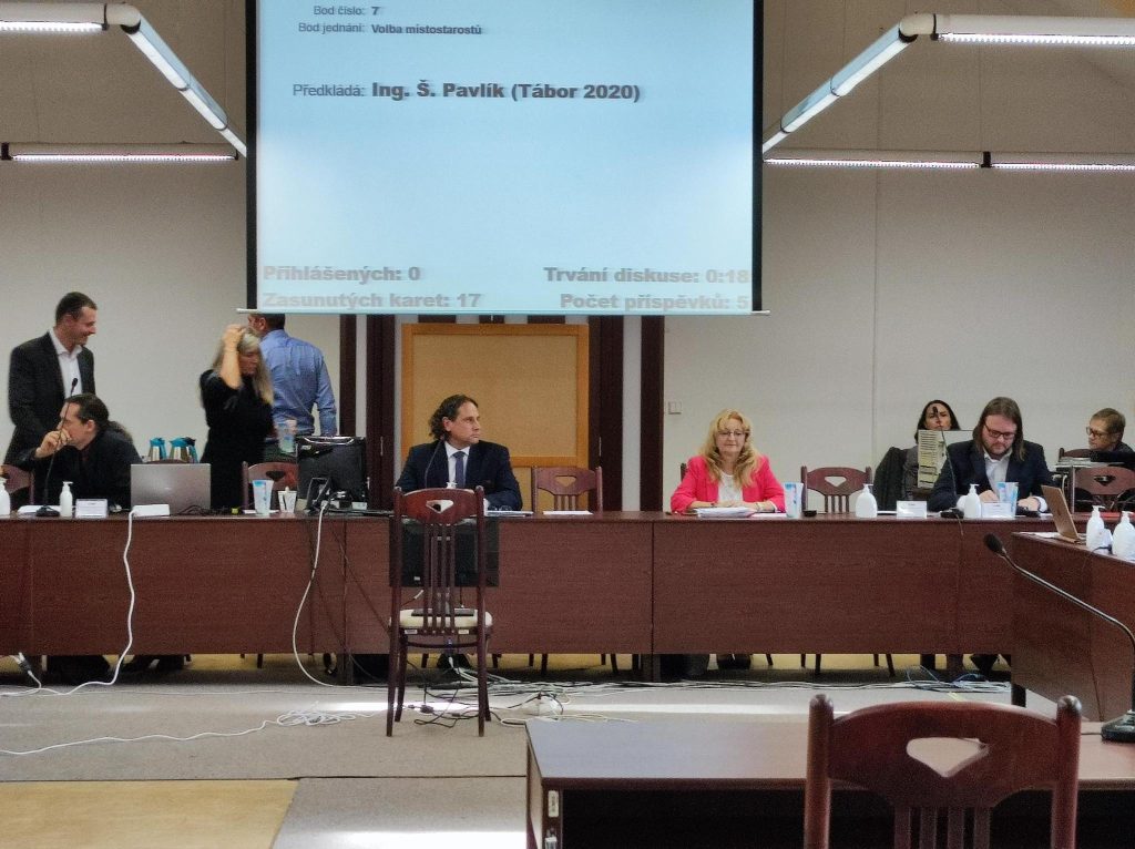 Nato se členové opozičních klubů ANO a Šance pro Tábor (ČSSD, KSČM a SPD) v počtu dvanácti lidí zvedli a opustili sál. Nechali koalici, ať si své lidi zvolí sama. Tak to také proběhlo – členové vedení města i radní, kterými byli zvoleni Ivana Mizerová a František Korbel z Tábora 2020, Jiří Horecký a Martina Smětáková ze Společně pro Tábor a Václav Klecanda z Pirátů, byli zvoleni 14 hlasy koaličních zastupitelů. Koalice má sice 15 křesel, ale z ustavujícího zasedání je omluven Martin Kraus z klubu Tábora 2020, a to kvůli covidu. Slib tedy složí až příště.