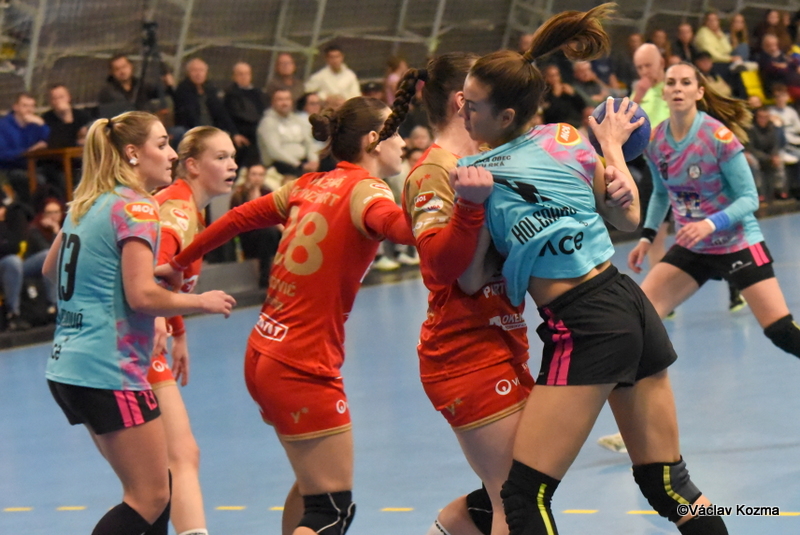 Po úvodní brance hostí domácí hráčky skóre vyrovnaly a na začátku 8. minuty šly do vedení 3:2. Jenže to bylo v utkání poprvé a naposledy. Hostující celek si za minutu a půl vzal vedení zpět a už ho z rukou nepustil. Velký podíl na tom měla brankářka Adéla Srpová, která chvílemi zavřela svou branku a navíc přesnými pasy posílala spoluhráčky do rychlých protiútoků, které je úspěšně zakočovaly. Na přestávku se šlo s tříbrankovým náskokem hostí a stále nebylo nic rozhodnuto.