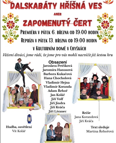 PÍSECKO – Dalskabáty hříšná ves, aneb zapomenutý čert. To je název nového představení, které pro letošní rok nacvičili ochotníci z Chyšek. Na premiéru se mohou lidé vydat už v pátek 6. března do kulturního domu v Chyškách. Začátek bude v 19 hodin. Ochotníci slibují, jako již tradičně, plno zábavných scének.