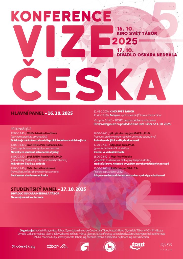 TÁBOR – Do Tábora míří pátý ročník konference Vize Česka. I letos přijaly pozvání zajímavé osobnosti. Pro veřejnost je na čtvrtek 16. října určený program v kině Svět, pro studenty středních škol pak v pátek 17. října diskusní panel v táborském divadle. Pořadatelem je město Tábor ve spolupráci s Jiřím Návarou, Jihočeským krajem a Gymnáziem Pierra de Coubertina. Vstupné zůstává na symbolické padesátikoruně, současně pořadatelé zavádějí místenky s vratnou zálohou sto korun.