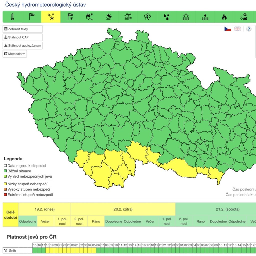 Výstraha platí pro České Budějovice, Český Krumlov, Dačice, Jindřichův Hradec, Kaplice, Prachatice, Trhové Sviny, Třeboň a Vimperk. „Očekávají se komplikace při chůzi, v dopravě i zásobování. V případě mokrého sněhu dochází ke škodám na stromech a lesním porostu, drátech elektrických vedení a k výpadkům v energetice,“ upozornili meteorologové s doporučením, aby lidé při cestování sledovali dopravní zpravodajství a jezdili velmi opatrně.