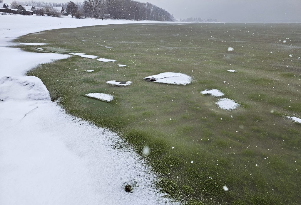Ve střední části nádrže však při pohledu z výšky nejsou pod dosud silnou ledovou pokrývkou výrazné akumulace vodního květu, které byly zřetelné v prosinci. „Nabízejí se dvě vysvětlení: buď je led natolik neprůhledný, že pod ním sinice nejdou vizuálně rozpoznat, nebo došlo k poklesu jejich koncentrace ve vodě, případně jde o kombinaci obou faktorů,“ vysvětluje hydrobiolog Petr Znachor z Biologického centra Akademie věd ČR, který situaci na Lipně nadále sleduje. Otevřenou otázkou zůstává, jak zimní přítomnost vysoké biomasy sinic ovlivní sezonní vývoj mikroskopických řas a sinic během roku.