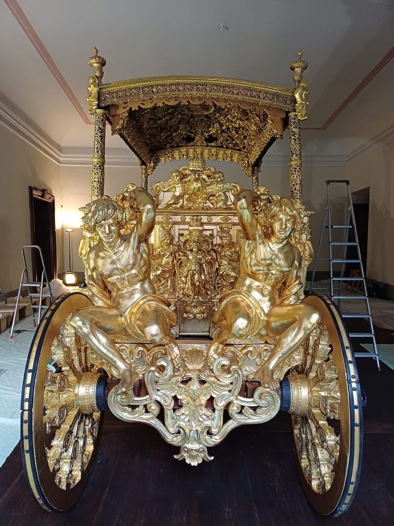 „Demontáži Zlatého vozu předcházel rozsáhlý restaurátorský průzkum a jeho konzervátorské ošetření. Opraveny byly i některé doposud chybějící části podvozku a dekorativní prvky,“ podotkla mluvčí Národního památkového ústavu Markéta Slabová.
